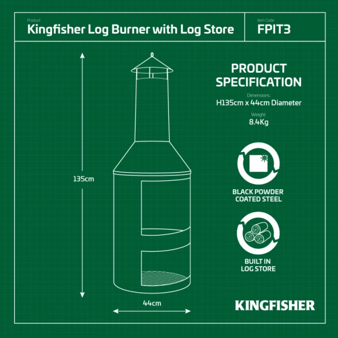 Made from black powder-coated steel with a built-in log store and a removable tray for easy emptying and cleaning.