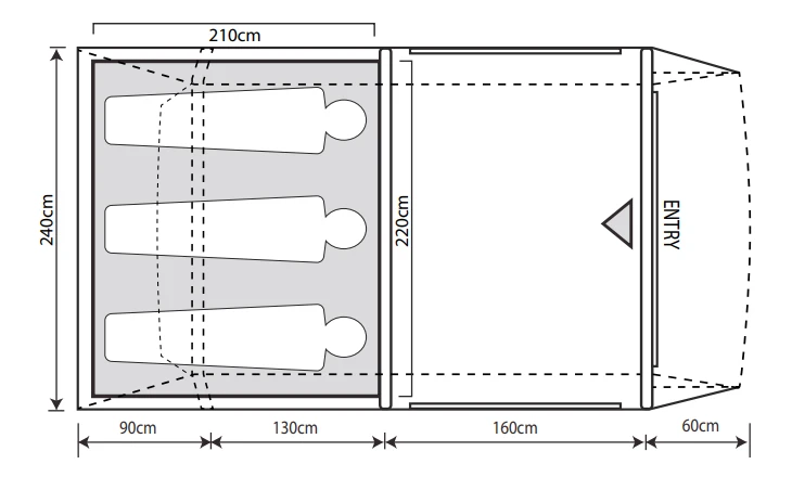 The breathable three-berth inner tent included can be clipped in to provide a luxurious sleeping area, designed to accommodate up to three average size adults. This is created using our darkened grey โtwilightโ fabric, in order to cut down on exterior light and help you attain a deep, cosy and uninterrupted nightโs sleep. This model utilises our bedroom ventilation system to maintain a comfortable sleeping environment by optimising airflow, whilst helping combat condensation and internal humidity.