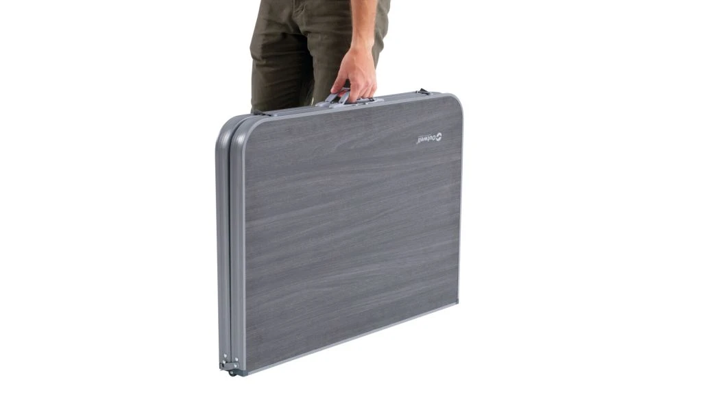 The Outwell Coledale L Table features telescopic oversized aluminium legs for easy, secure height adjustment and flat feet for load-bearing support.