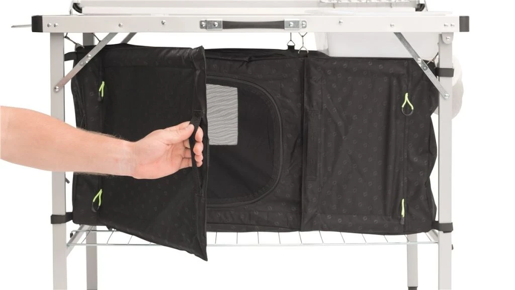 Not only does this invaluable table provide a stable place to prepare and cook a meal but also includes enclosed storage for pots food and gas.