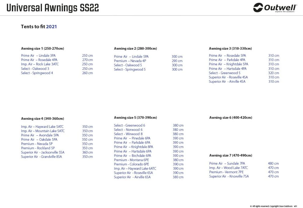 Designed to fit all Outwell inflatable and poled tents (except Encounter tents), you can easily extend yours with an Outwell Universal Awning. As superbly engineered and carefully crafted designs, each is easy to attach so you can quickly add sheltered space to your living area for relaxing or to use it as storage. With steel poles and Outtexยฎ 4000 Select fabric, the sturdy design is stable and durable whilst for practical access via the sloping front door, each has a fold-flat groundsheet.