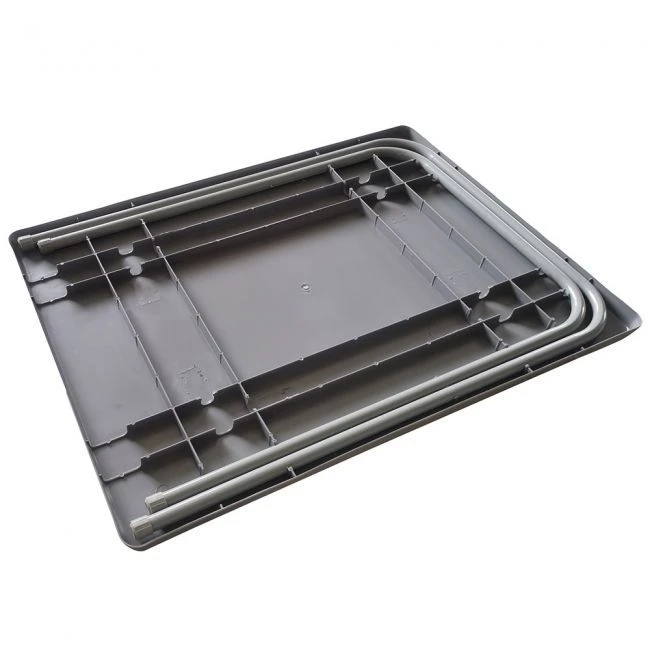 Extremely lightweight, easy to use fold-out table with a solid plastic top that is easy to clean and waterproof. The strong, powder-coated frame is finished in the same colour as the tabletop which finishes the product off very nicely. The tabletop is easily removed to make it extremely easy to store and clean. The table can be used in two different heights by switching the frame around easily to add extra convenience.